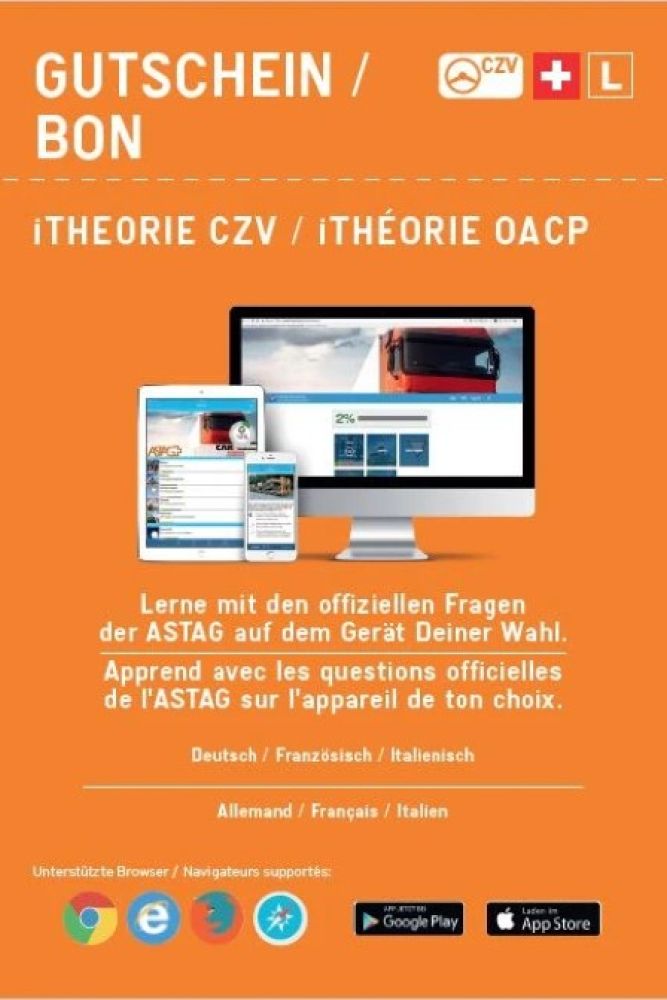 App iTheorie CZV für Kategorie Lastwagen C oder Car D. Um die gewerbsmässige Zulassung erreichen zu können, ist diese theoretische sowie praktische Prüfung zwingend. Lassen Sie sich beraten und kommen Sie bei uns vorbei. Wir zeigen Ihnen, wie Sie diese theoretischen Teil bestehen können, egal welche Kategorie sie in Angriff nehmen wollen. Wir sind für Sie da.